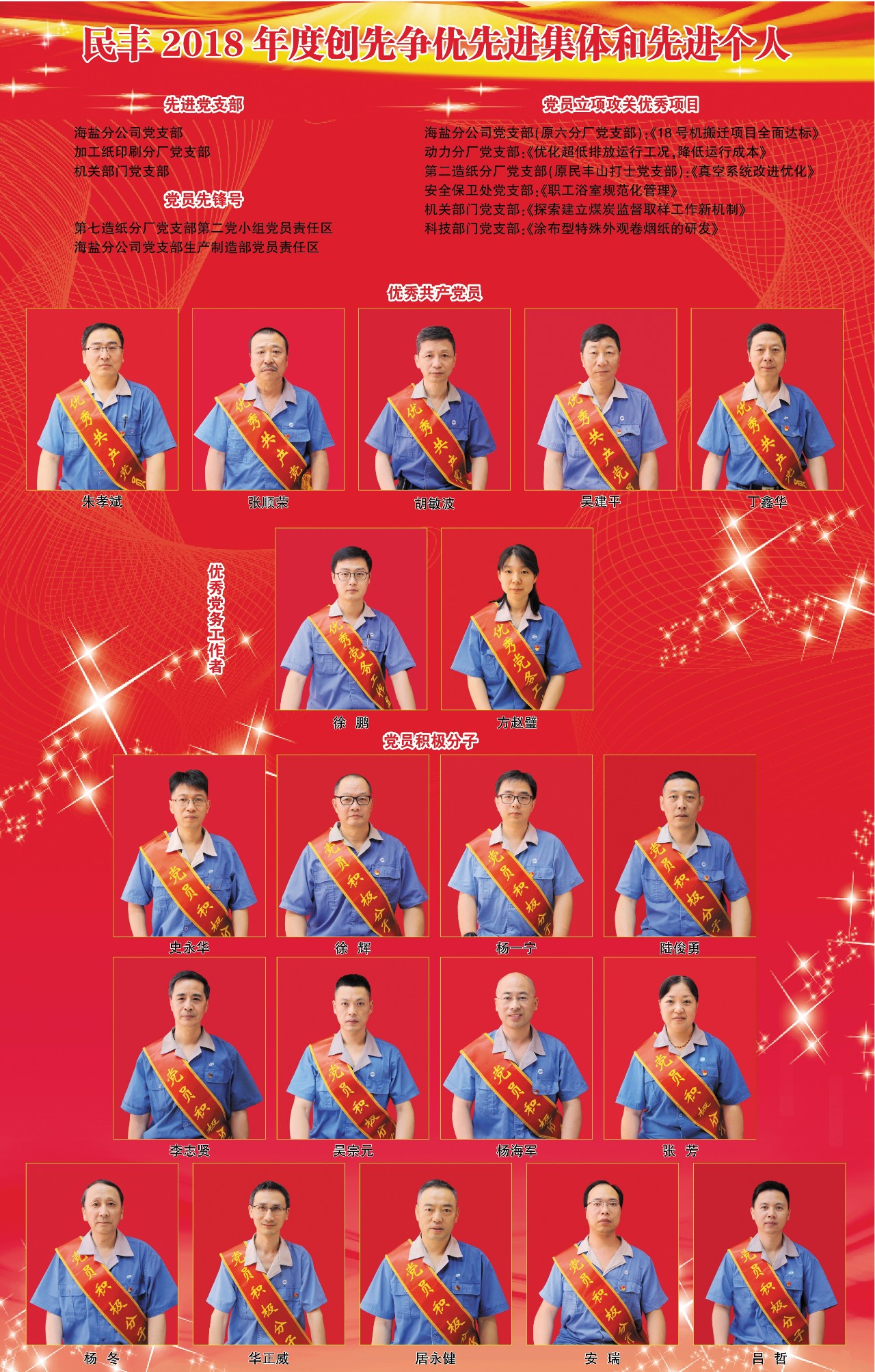 会上,尊龙凯时人生就是博特纸党委副书记陶毅铭宣读了《关于表彰2018年度创先争优先进集体和先进个人的决定》。大会对海盐分公司、加工纸印刷分厂、机关部门3个先进党支部,七分厂党支部第二党小组党员责任区、海盐分公司党支部生产制造部党员责任区2个党员先锋号,海盐分公司党支部《18号机搬迁项目全面达标》等6个党员立项攻关优秀项目,朱孝斌等5名优秀共产党员,徐鹏等2名优秀党务工作者,史永华等13名党员积极分子进行了表彰。受表彰的先进集体、先进个人代表先后作了经验交流发言。